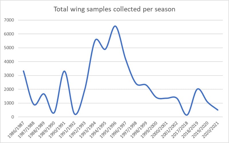 The total number of wings provided to the survey had varied quite widely over the years and since the end of the survey in 2002 we have not yet managed to achieve the contributions that were seen in previous years. We would like to thank everyone who has supported the survey over the years and encourage you to promote this scheme to your fellow wildfowlers and duck and goose shooters.