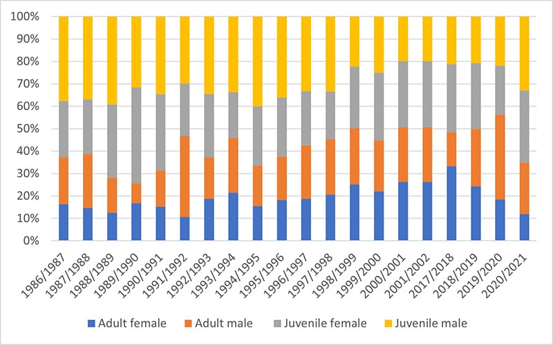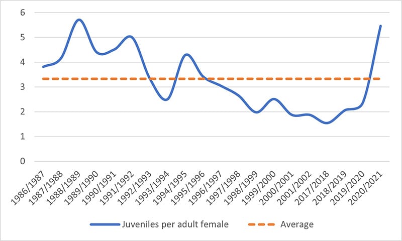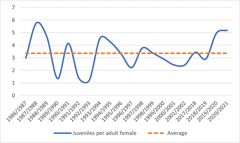 From the data collected we can also calculate a breeding success rate from the number of juveniles per adult female. There are some quite large fluctuations seen here however again, the fluctuations have remained consistently around the mean and there is no increasing or declining trend.